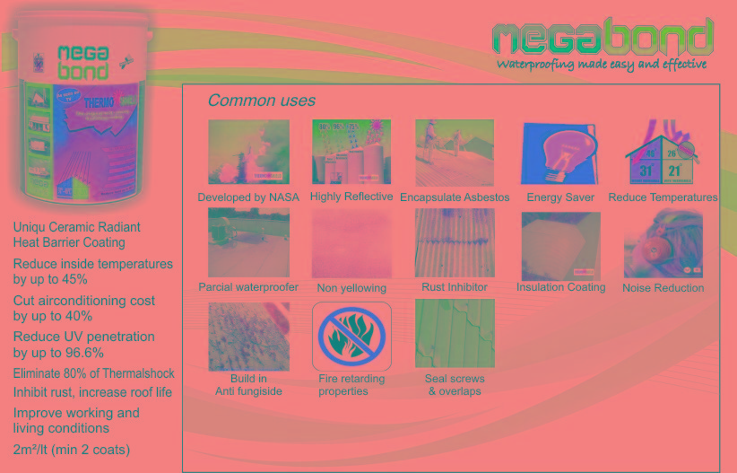 Megabond Thermoshield is a unique heat reflective coating. It was origanally pioneerd by NASA with the space shuttle. Thermoshield has been tested to decrease heat gain by up to 45%. Thermoshield is not just suitable for the hot summers, but will also maintain the temperature inside during the cold winter periods. It is an extremely durable, fully washable and an stain resistant roof coating. |